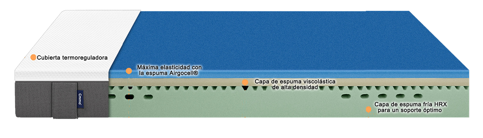 Nucleo de espuma HR de alta densidad. La espuma fría aporta soporte óptimo con agujerasen la parte de los hombros y la cadera, corrigiendo la postura durante el sueño.